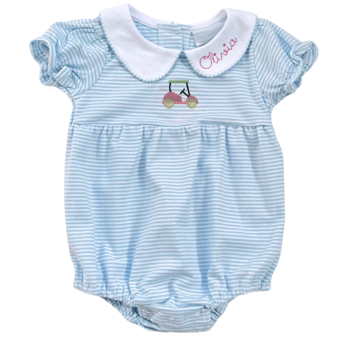 This adorable baby bubble features a charming Peter Pan collar and playful golf-themed embroidery, making it the perfect outfit for your little one’s first outing to the course or any fun day out. Crafted from soft, breathable cotton, it’s designed for comfort and ease of movement. The whimsical golf details—think tiny clubs, tees, and balls—are carefully stitched along the fabric, adding a touch of fun without being too bold. With snap closures at the bottom for easy diaper changes and a relaxed, roomy fit, this bubble is both practical and oh-so-cute. A perfect blend of playful and classic, it’s an outfit that’s sure to turn heads!