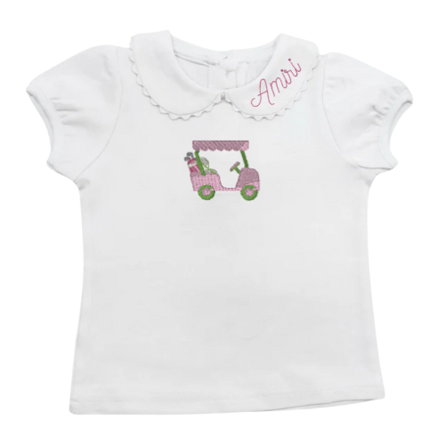 A sweet short sleeve shirt featuring a charming ric rac trim collar and golf-themed personalization. Made from soft, comfortable fabric, it’s perfect for everyday wear, outings, or special occasions.