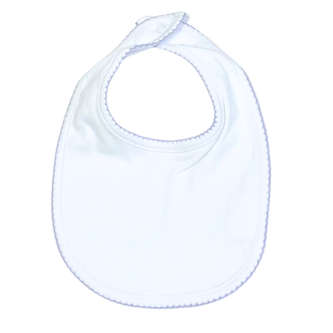 Add a touch of elegance to your little one's essentials with our picot trim bib, made from 100% soft, breathable cotton for ultimate comfort. The delicate picot trim adds a refined, classic look, while the snap closure ensures a secure fit for easy dressing and quick removal.